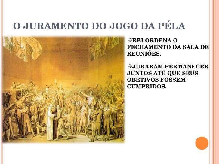 O que foi o juramento da Sala do Jogo da Pela? Trata-se de um episódio que se associa à Revolução Francesa. Ocorreu no dia 20 de junho de 1789, após a corte ter impedido a efetivação da reunião da Assembleia na sala onde se costumava realizar, fruto da sua política de oposição ao Terceiro Estado.