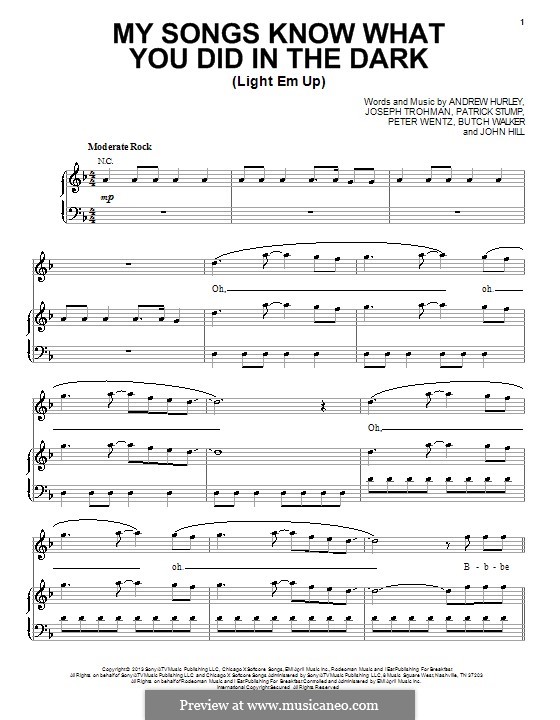 Composition. Sheet music for the song "My Songs Know What You Did in the Dark (Light Em Up)" shows the key of D minor and tempo range of 76 to 80 beats per minute.. Music video. The music video for the song is the first of the Young Blood Chronicles, an ongoing series with the band filming a video for every song on Save Rock and Roll.It begins late at night, with a figure - later revealed to.