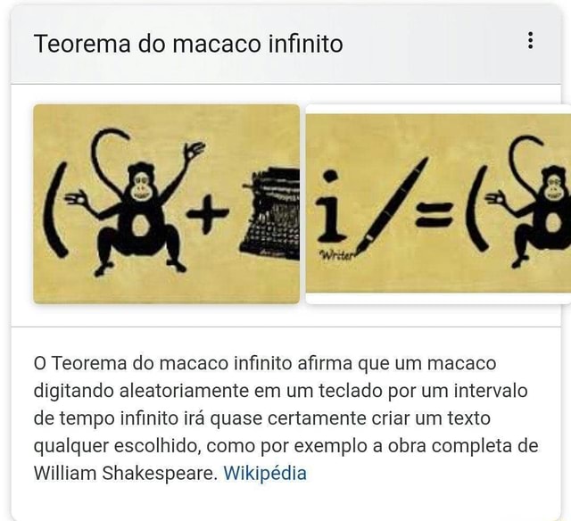 Você já ouviu dizer que infinitos macacos batendo aleatoriamente em um teclado conseguiriam reproduzir todas as obras de Shakespeare, todo o dicionário e tod.
