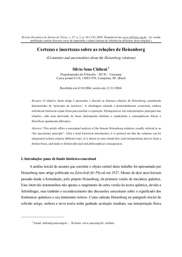 Departamento de Filosofla, IFCH, Unicamp, Campinas, SP, Brasil Recebido em 4/10/2004; Aceito em 21/11/2004 O objetivo deste artigo ¶e apresentar e discutir as famosas rela»c~oes de Heisenberg, usualmente denominadas de \princ¶‡pio da incerteza". A abordagem adotada ¶e primordialmente conceitual, embora refer^encias hist¶oricas