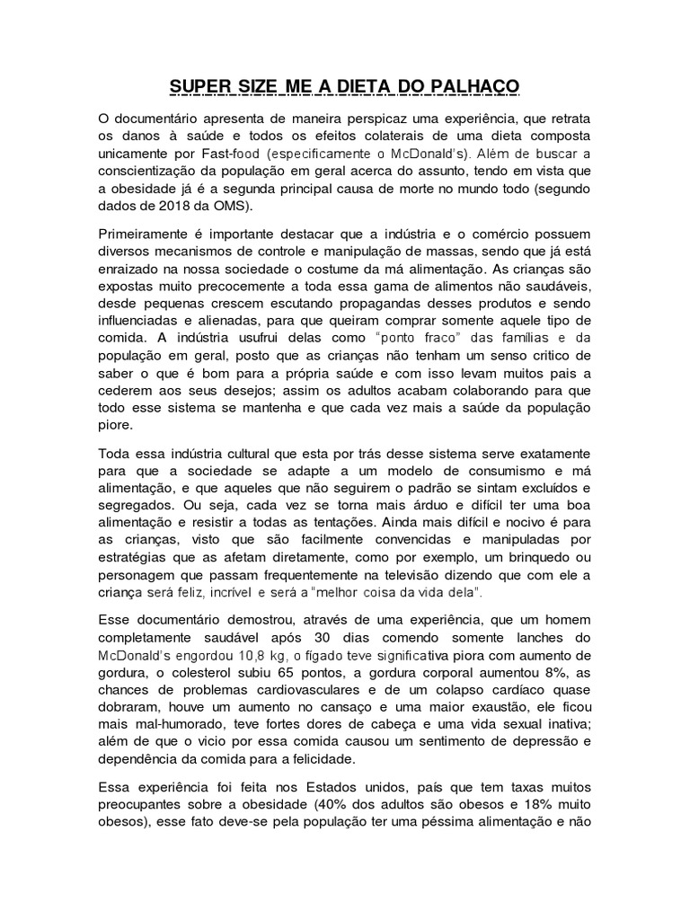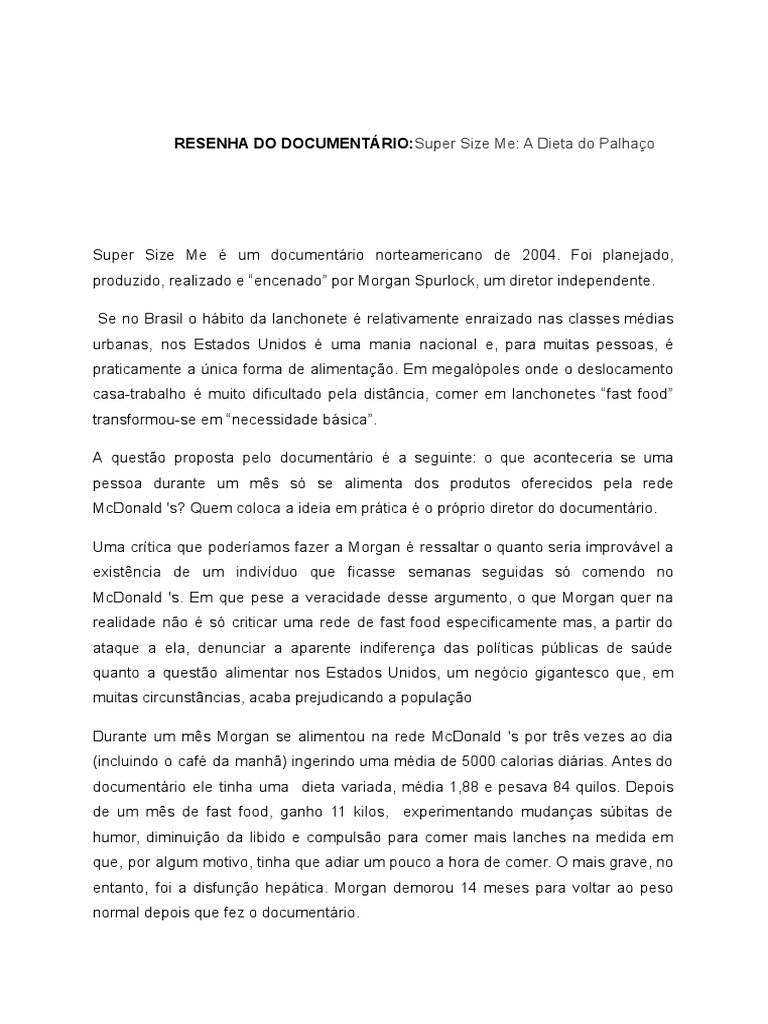 RESENHA DO DOCUMENTÁRIO Super Size Me A Dieta Do Palhaço PDF